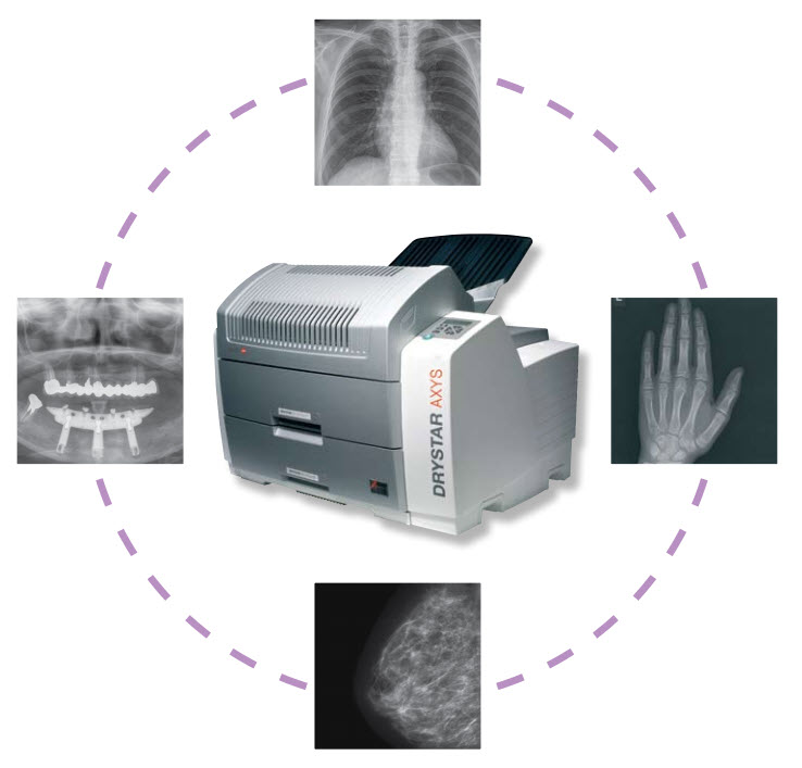 DRYSTAR AXYS fits perfectly into any type of facility, from smaller clinics with limited space, to larger hospitals with many departments. Use it in a centralized imaging environment to support a broad range of applications, including CT, MR, DSA and US, as well as CR/DR applications for GenRad, Mammography, Orthopaedics, Dental Imaging and more