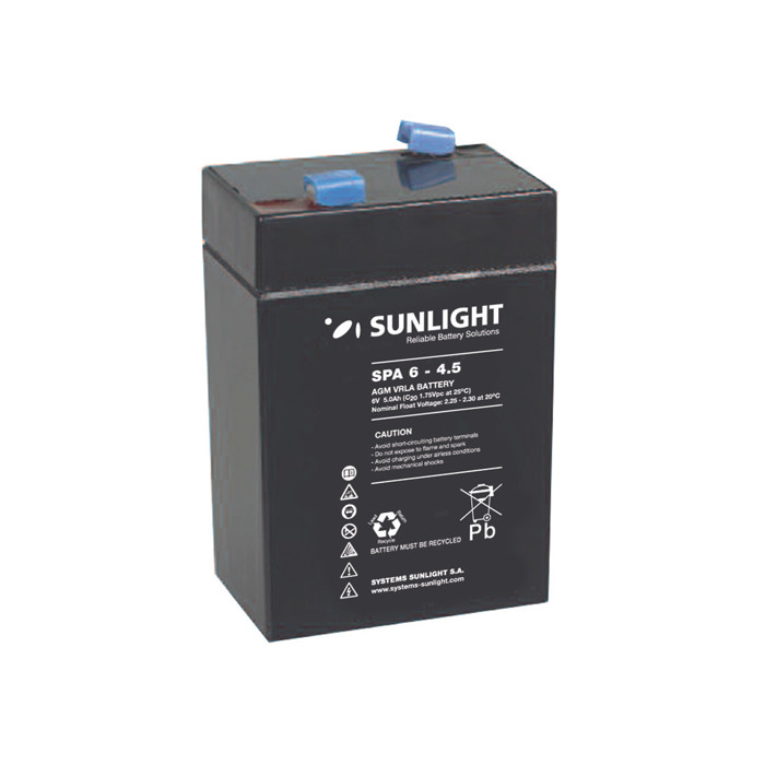 Μπαταρία Sunlight SPA6-4.5 VRLA – AGM τεχνολογίας – 6V 4.5Ah (C20) με 3-5 χρόνια προσδόκιμο χρόνο ζωής , κατάλληλη για συστήματα Ups , συναγερμούς ασφαλείας , συστήματα έκτακτης παροχής ενέργειας , ηλεκτρικά παιχνίδια κ.α .